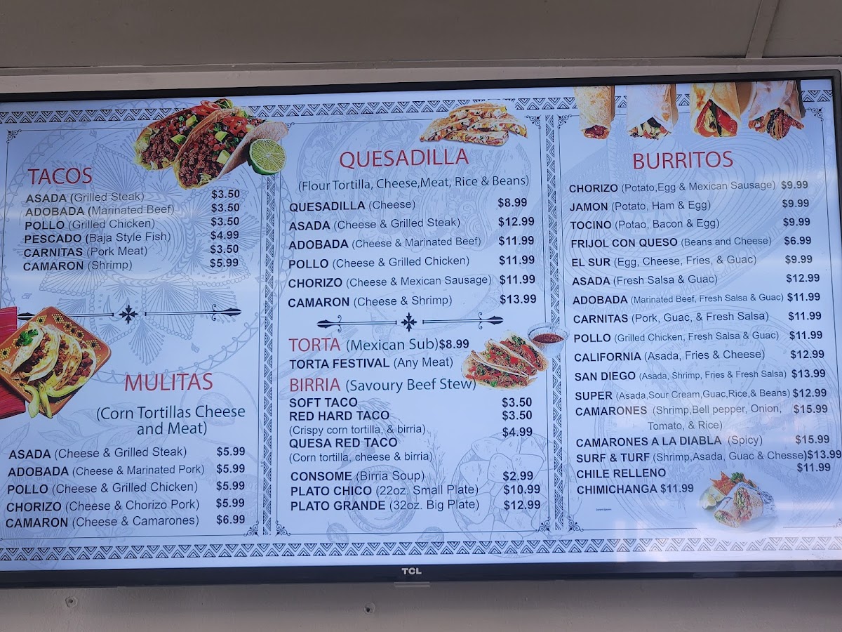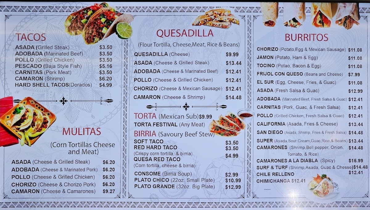 Moving into shared bites, the Chicken Nachos, Carnitas Fries, and Super Nachos layered with cheese, guacamole, and sour cream are built for indulgence. The taco selection shines with specialties such as the Taco Gobernador, Shrimp Taco, and Taco Suave Pollo, alongside the crispy Roll Tacos Beef (5). Seafood lovers will appreciate the range of caldos, including the robust Caldo 7 Mares and Caldo de Camaron, as well as whole fish preparations like the Mojarra a la Diabla and Huachinango Frito.