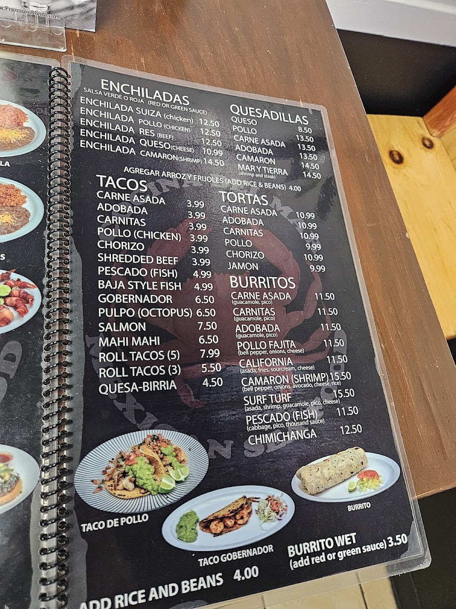 Cocina Del Mar delivers a menu that truly captures the essence of Mexican coastal flavors, offering variety and richness in every category. The tostadas such as the Tostada Del Mar, Tostada de Camaron, and Tostada Verde (Aguachiles) bring freshness and bold taste to the forefront. For something heartier, the tortas like the Torta Carnitas, Torta Adobada, and Torta Chorizo stacked with beans, guacamole, and pico de gallo provide a filling, flavorful option. Breakfast is just as inviting, with comforting choices like Huevos Rancheros Combo, Huevos a la Mexicana, and the satisfying Steak & Egg.